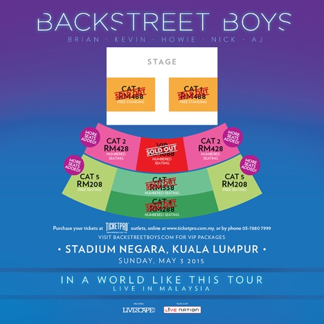 The Backstreet Boys “In A World Like This” Tour in Malaysia will take place at Stadium Negara, Kuala Lumpur on May 3. The additional Cat 2 tickets are priced at RM428 and Cat 5 tickets at RM208 excluding RM3 ticketing fee. The rest of the tickets to the show is now sold out. For more information or to obtain updates on the Backstreet Boys show in Kuala Lumpur, logon to https://www.facebook.com/livescapeasia.