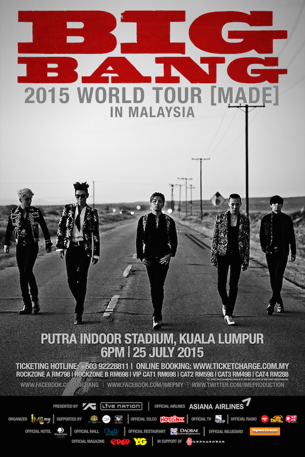 IME Productions dengan bangganya mengumumkan BIGBANG konsert “BIGBANG 2015 WORLD TOUR [MADE] IN MALAYSIA” akan diadakan di Stadium Putra Indoor, Bukit Jalil pada jam 6:00 petang (Sabtu), 25 Julai 2015. Konsert ini merupakan konsert kedua mereka di sini selepas ‘BIGBANG Alive Galaxy Tour 2012 in Malaysia’ yang talah menarikkan 15,000 peminat dalam negeri dan luar negara.