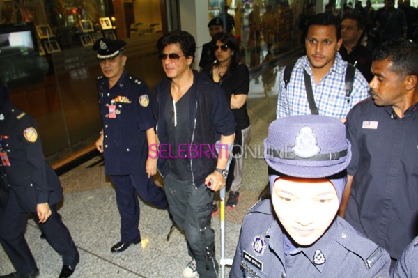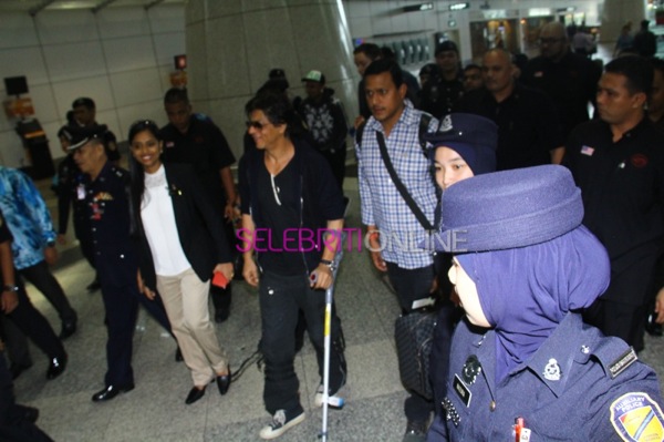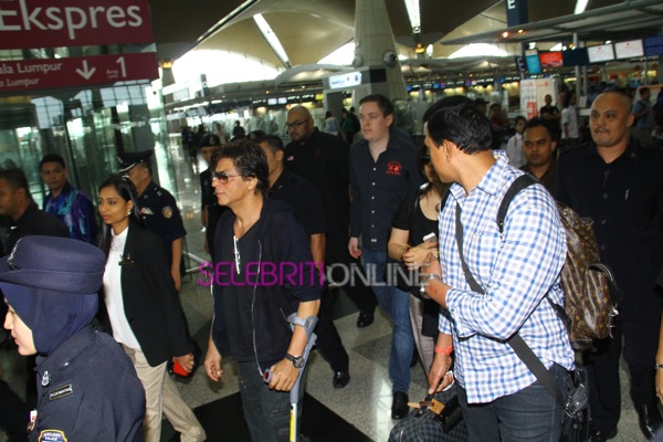 Raja Bollywood, Shah Rukh Khan (SRK) telah selamat sampai di KLIA sekitar jam 7.40 pagi sebentar tadi dengan penerbangan Malaysia Airlines (MH195).Namun beliau kelihatan bertongkat selepas keluar dari Bilik VIP KLIA.