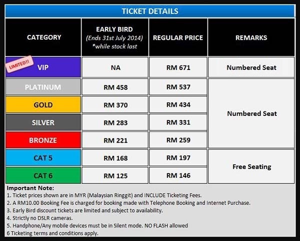 Ticket prices: VIP – RM648 (Limited, Meet & Greet)