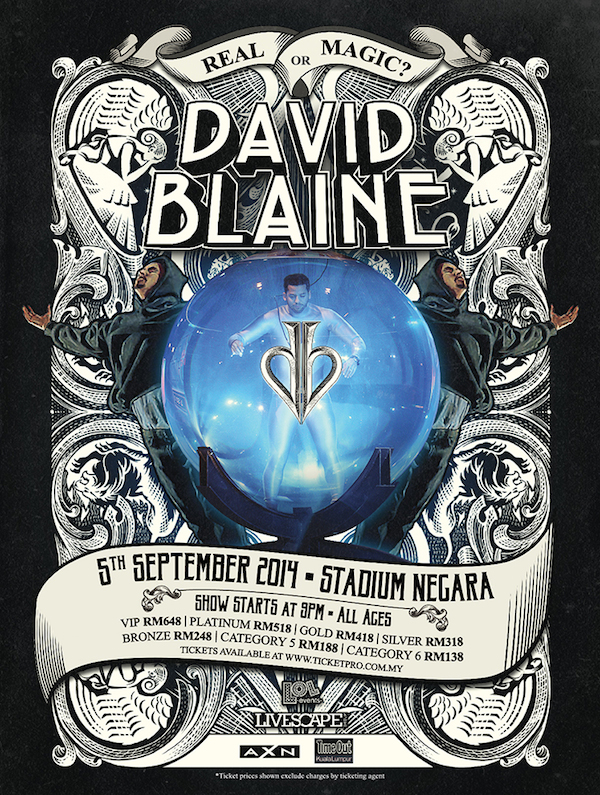 LOL Events & Livescape Asia is proud to present the world’s most enigmatic magician, David Blaine, live in Malaysia on 5th Sept 2014 in Stadium Negara, Kuala Lumpur. David Blaine is conventionally a street magician who is known for his mind blowing endurance stunts such as “Frozen in Time” in which he was frozen into a block of ice for 72 hours. Other stunts include “Above the Below”, in which he went without food for 44 days and “Vertigo”, where he stood for 44 hours on a 22 inch platform. “Human Aquarium” involved submersion in a water-filled sphere for seven days, receiving air and food through tubes. In a dramatic finale, he failed in his attempt to break the world record for holding breath under water, while simultaneously escaping heavy chains.