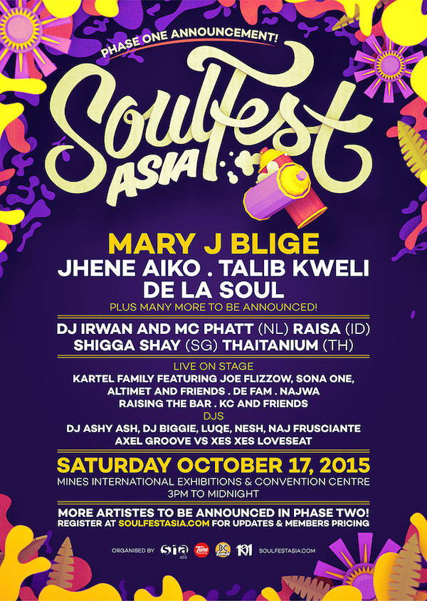 Kemunculan pertama Soulfest Asia melibatkan tiga dewan di mana Ratu Hip-Hop dan muzik soul, Mary J. Blige, akan memberi persembahan, dan calon Grammy Jhene Aiko, serta artis Hip-Hop kegemaran ramai Talib Kweli and De La Soul, bersama Joe Flizzow dan keluarga Kartel, penyanyi soul Najwa dan kolektif hip-hop Raising The Bar secara langsung di pentas. Menepati gelaran beserta nama Asia, Soulfest Asia turut membariskan superstar serantau seperti rapper Singapura kegemaran ramai, Shigga Shay. Ramai lagi artis antarabangsa, serantau dan tempatan yang akan diumumkan dalam minggu-minggu yang akan datang!